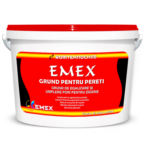 Grund pentru Amorsare si Egalizare “Emex” - un primer de inalta calitate, profesional, de culoare alba, diluabil cu apa, fabricat pe baza de copolimeri acrilici, aditivi specifici si fileri, slefuibil, pentru pregatirea superioara a zidariilor si gleturilor, sau oricaror alte suprafete de baza minerala, in vederea acoperirii cu vopsele lavabile acrilice, vinilice sau vinil-versatate. Este compatibil, de asemenea, cu toate amorsele din gama.